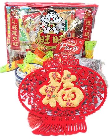 大礼包里春联年画、坚果零食、卡通玩偶、年夜饭饺子券等年货应有尽有。